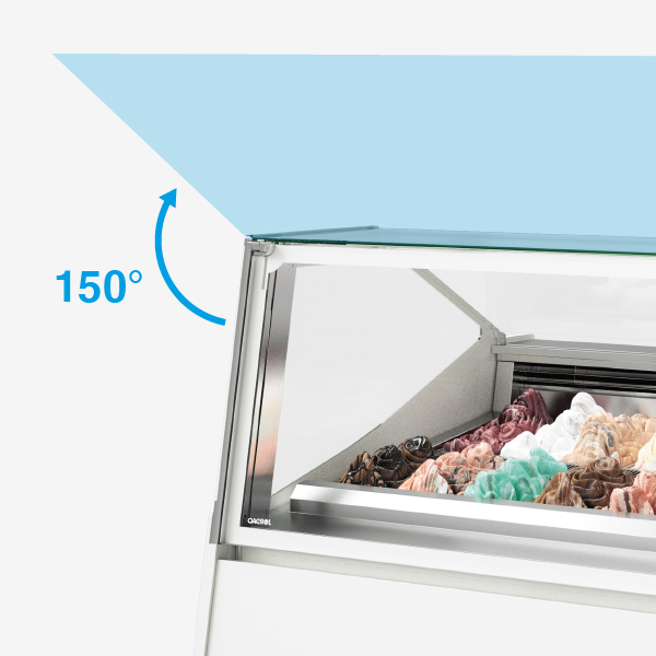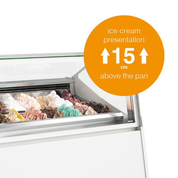 Vitrine spécialement conçue pour les glaces artisanales et semi-industrielles, prête à exposer et à conserver les glaces jusqu'à 15 cm au-dessus du bac.