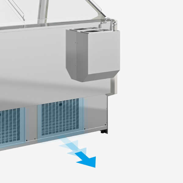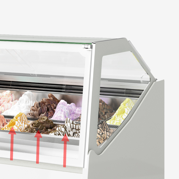 Système de refroidissement ventilé avec double canal d'air et ventilation douce qui assure une température homogène dans tout le présentoir, préservant correctement les caractéristiques et la qualité de vos glaces, même dans des conditions ambiantes difficiles.