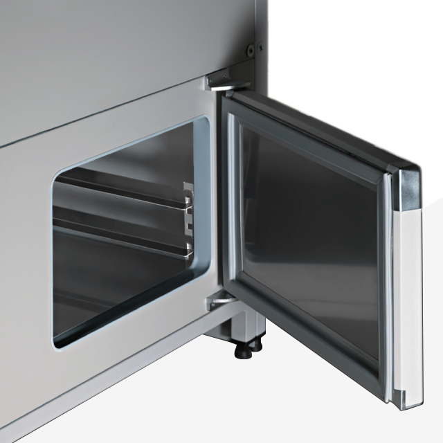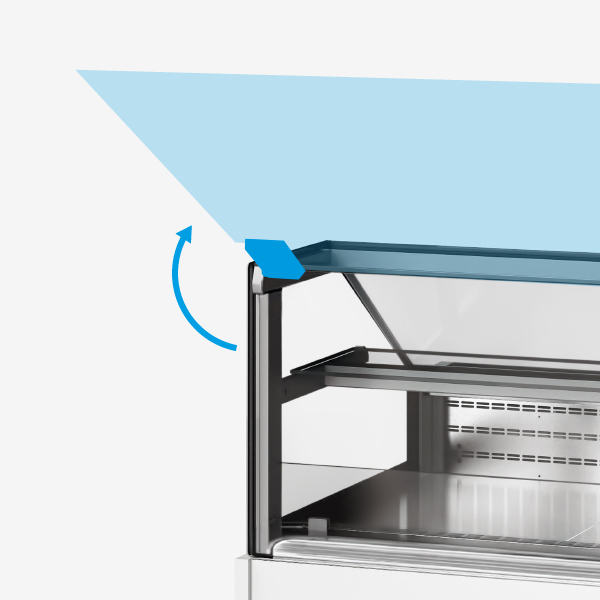 Vidro frontal com mola a gás para fácil acesso e limpeza do expositor.